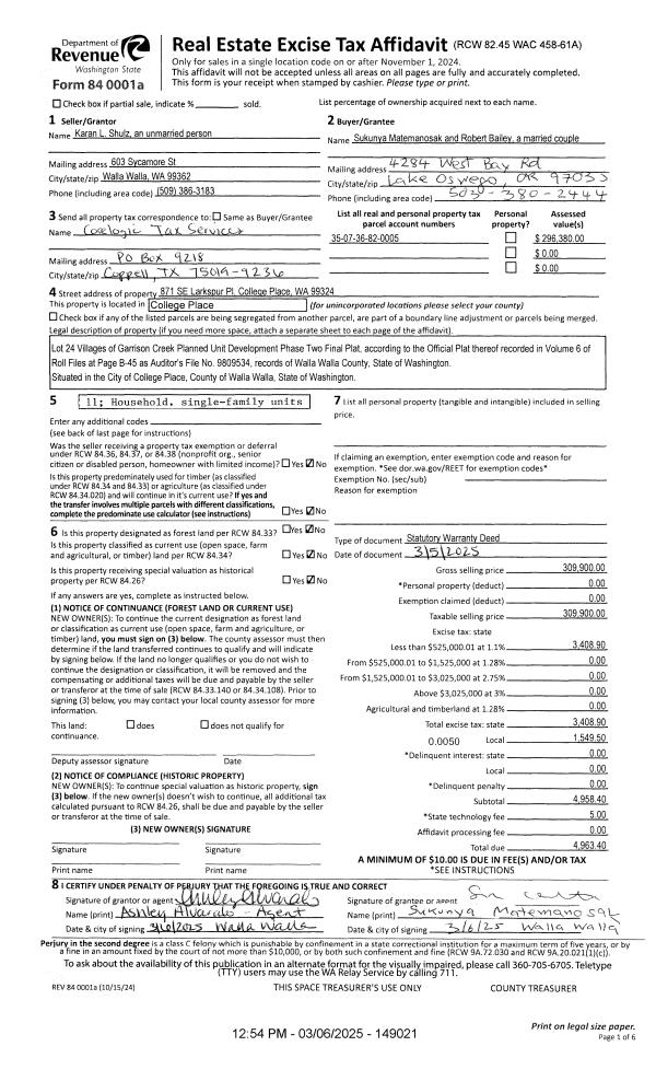 | 1 | 03/06/2025 | SWD | STATUTORY WARRANTY DEED | SHULTZ KARAN L | MATEMANOSAK SUKUNYA & ROBERT BAILEY | | | $309,900.00 | 149021 | 2025-01163 |