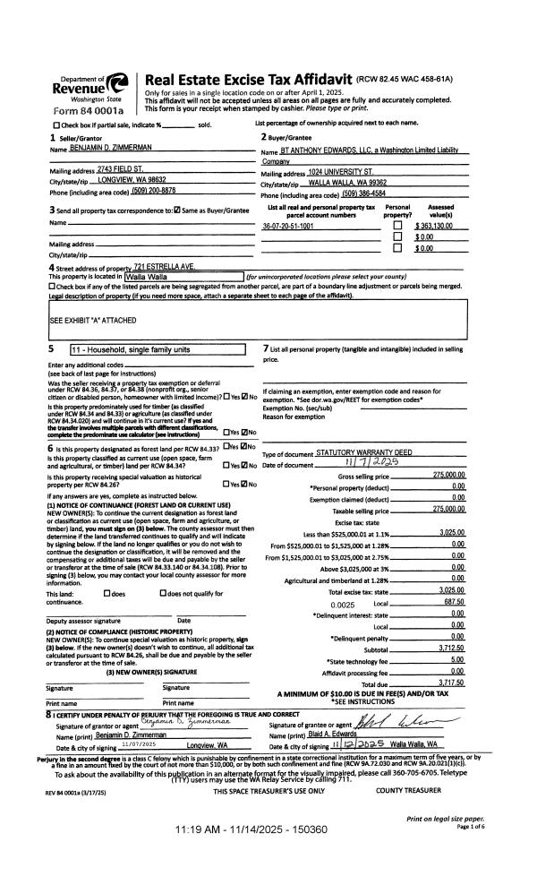 | 1 | 11/14/2025 | SWD | STATUTORY WARRANTY DEED | ZIMMERMAN BENJAMIN D | BT ANTHONY EDWARDS LLC | | | $275,000.00 | 150360 | 2025-07062 |