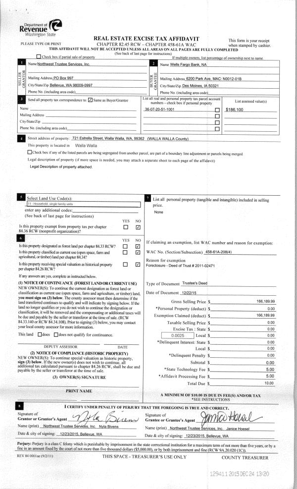| 3 | 12/24/2015 | TRUSTEES D | TRUSTEE'S DEED | KERR VERNON L & NAOMA J | WELLS FARGO BANK NA | | | $166,189.00 | 129411 | 2015-11035 |