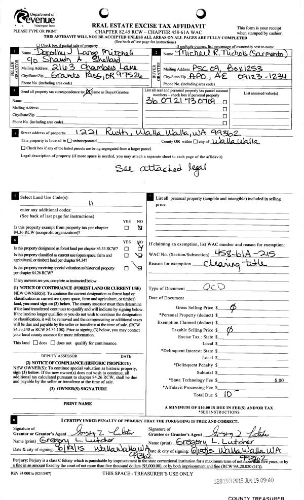 | 2 | 06/19/2015 | QCD | QUIT CLAIM DEED | LANGE D & D MICHELL LIFE EST | NICHOLS MICHAEL R | | | | 128193 | 2015-05138 |