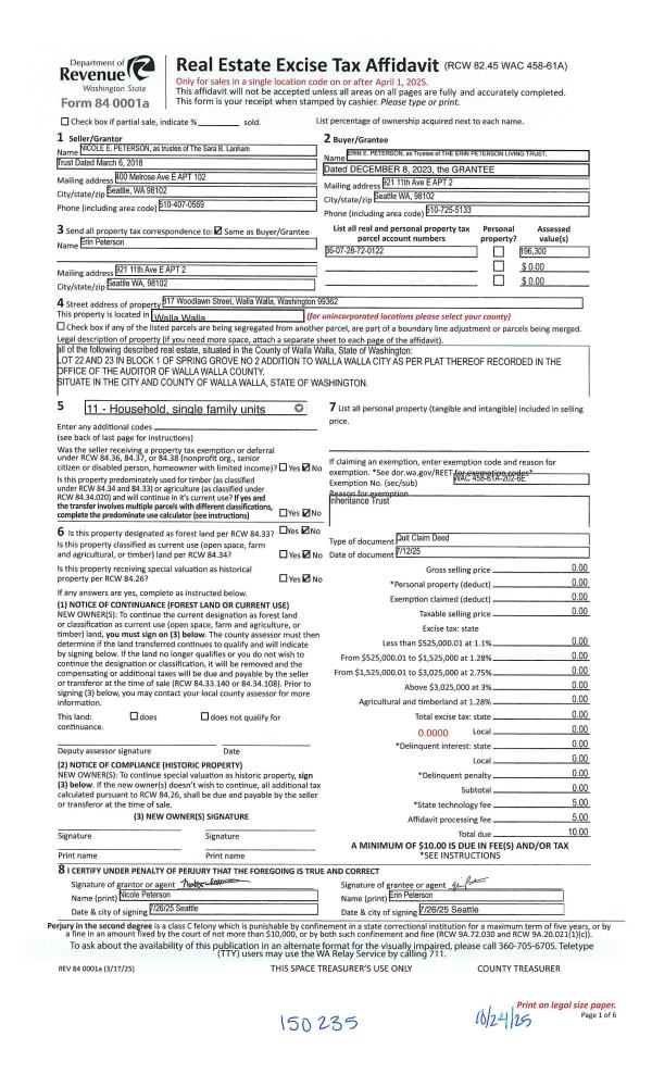| 1 | 10/24/2025 | QCD | QUIT CLAIM DEED | LANHAM SARA B TRUST | PETERSON ERIN LIVING TRUST | | | | 150235 | 2025-06583 |