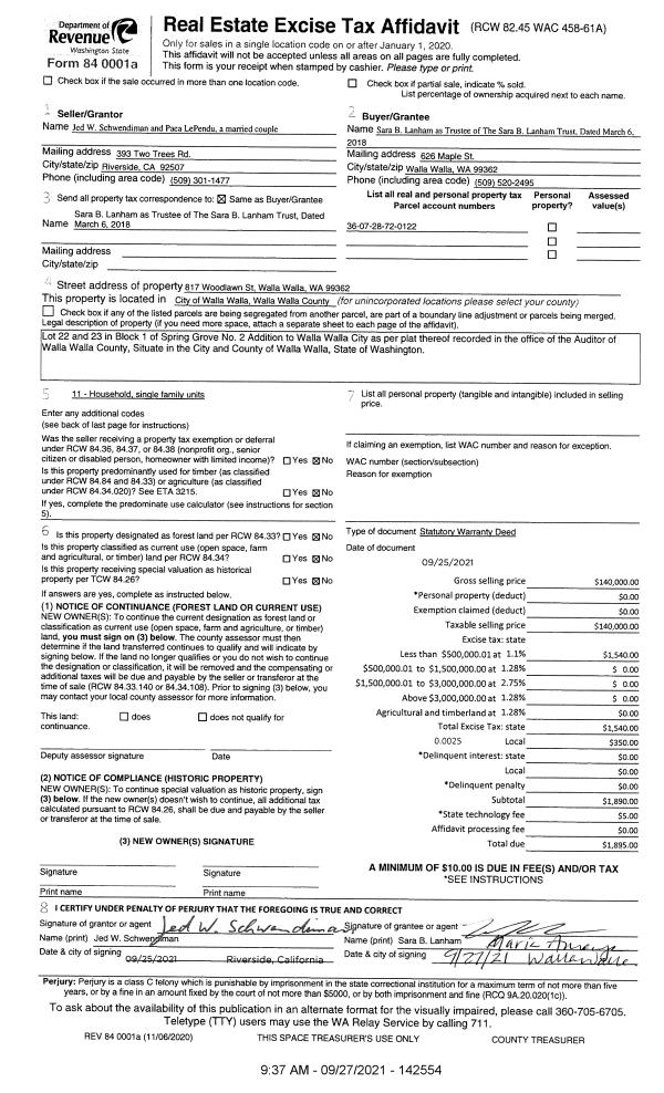 | 2 | 09/27/2021 | SWD | STATUTORY WARRANTY DEED | SCHWENDIMAN JED W | LANHAM SARA B TRUST | | | $140,000.00 | 142554 | 2021-11768 |
