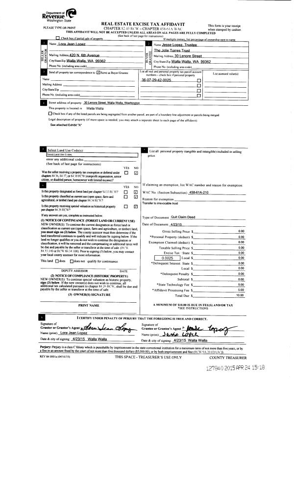 | 1 | 04/23/2015 | QCD | QUIT CLAIM DEED | LOPEZ LORA J | TORRES JOLIE TRUST | | | $0.00 | 127840 | 2015-03353 |