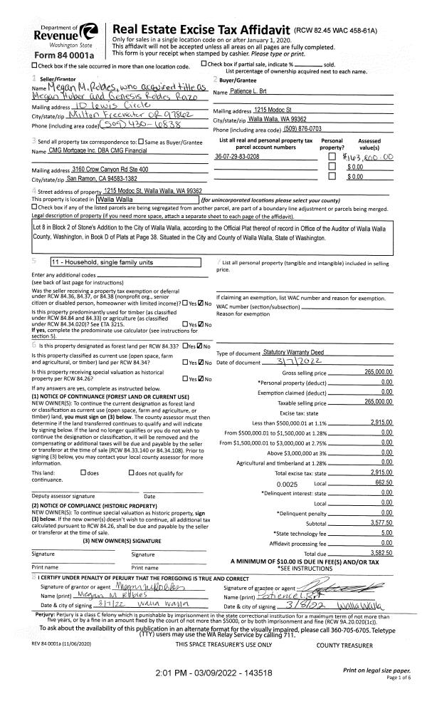 | 1 | 03/09/2022 | SWD | STATUTORY WARRANTY DEED | HUBER MEGAN M | BRT PATIENCE L | | | $265,000.00 | 143518 | 2022-02014 |