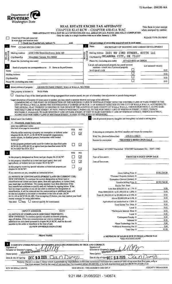 | 3 | 12/23/2020 | FORE | FORECLOSURE | SCOGGIN VELDA E | SECRETARY OF HOUSING AND URBAN DEVELOPMENT | | | $0.00 | 140674 | 2021-00545 |