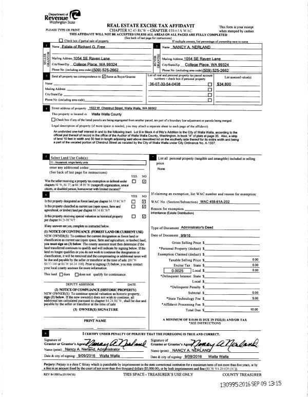 | 2 | 09/09/2016 | ADMD | ADMINISTRATOR'S DEED | FREE RICHARD G | NERLAND NANCY A | | | | 130995 | 2016-07357 |