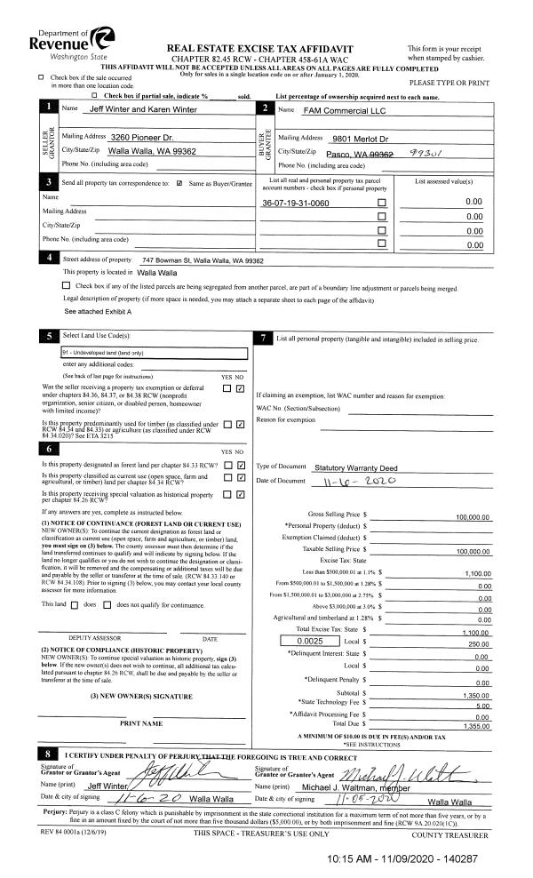 | 1 | 11/09/2020 | SWD | STATUTORY WARRANTY DEED | WINTER JEFF & KAREN | FAM COMMERCIAL LLC | | | $100,000.00 | 140287 | 2020-11768 |