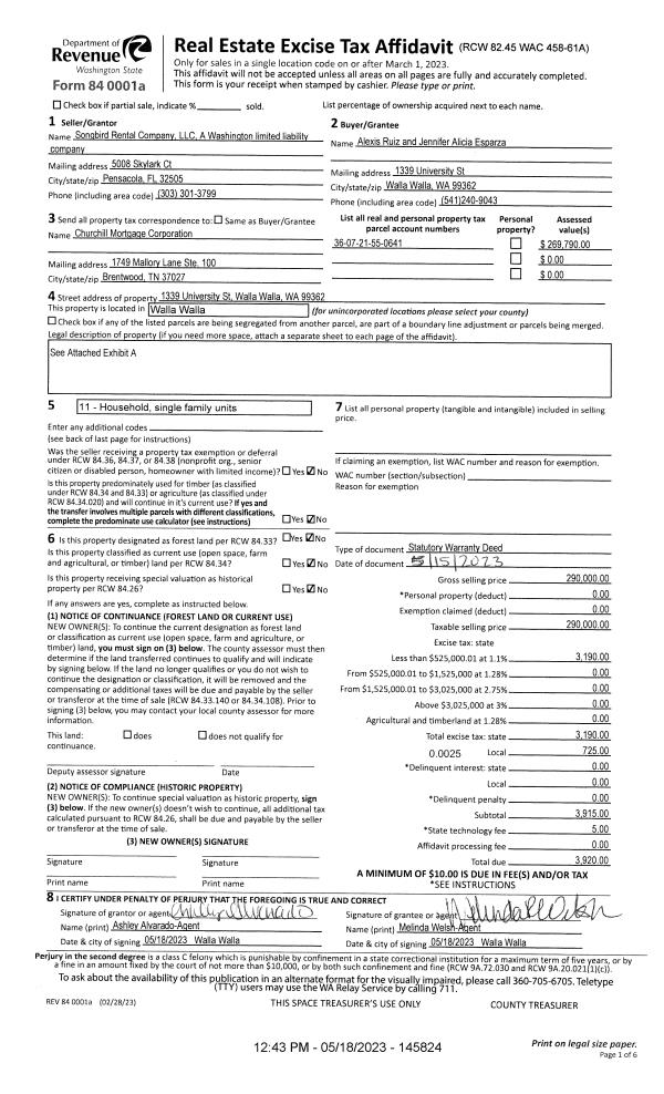 | 1 | 05/18/2023 | SWD | STATUTORY WARRANTY DEED | SONGBIRD RENTAL COMPANY LLC | RUIZ ALEXIS | | | $290,000.00 | 145824 | 2023-02650 |