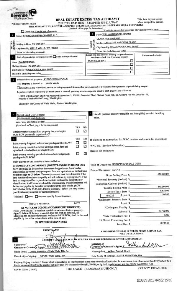 | 2 | 03/22/2013 | WARRANTY D | WARRANTY DEED | SPRINGER DEVELOPMENT LLC | GRANT, WILLIAM RANDALL | | | $440,000.00 | 123659 | 2013-02746 |