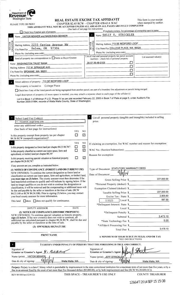 | 1 | 09/11/2014 | SWD | STATUTORY WARRANTY DEED | BEKKER VIKTOR & NADEZHDA | STRICKLER SALLY S | | | $227,000.00 | 126647 | 2014-06752 |