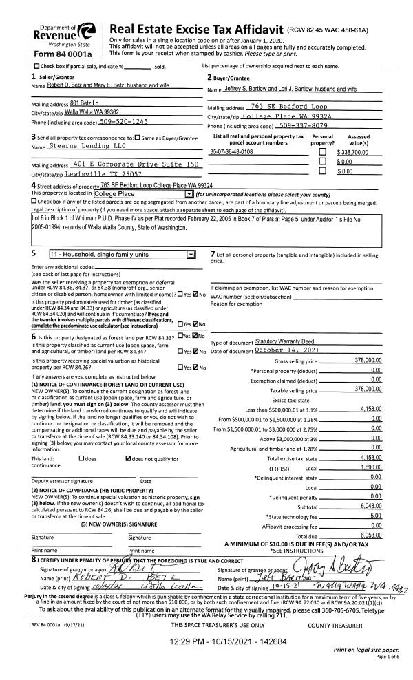 | 1 | 10/15/2021 | SWD | STATUTORY WARRANTY DEED | BETZ ROBERT D & MARY E | BARTLOW JEFFREY S & LORI J | | | $378,000.00 | 142684 | 2021-12558 |