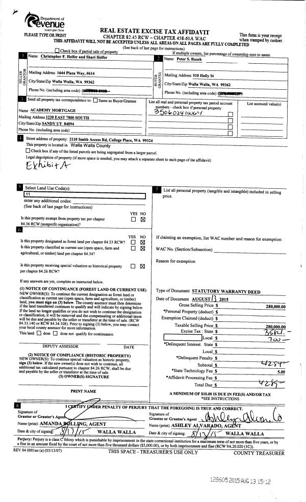 | 2 | 08/13/2015 | SWD | STATUTORY WARRANTY DEED | HELFER CHRISTOPHER & SHARI | RUSCH PETER S | | | $280,000.00 | 128605 | 2015-07101 |