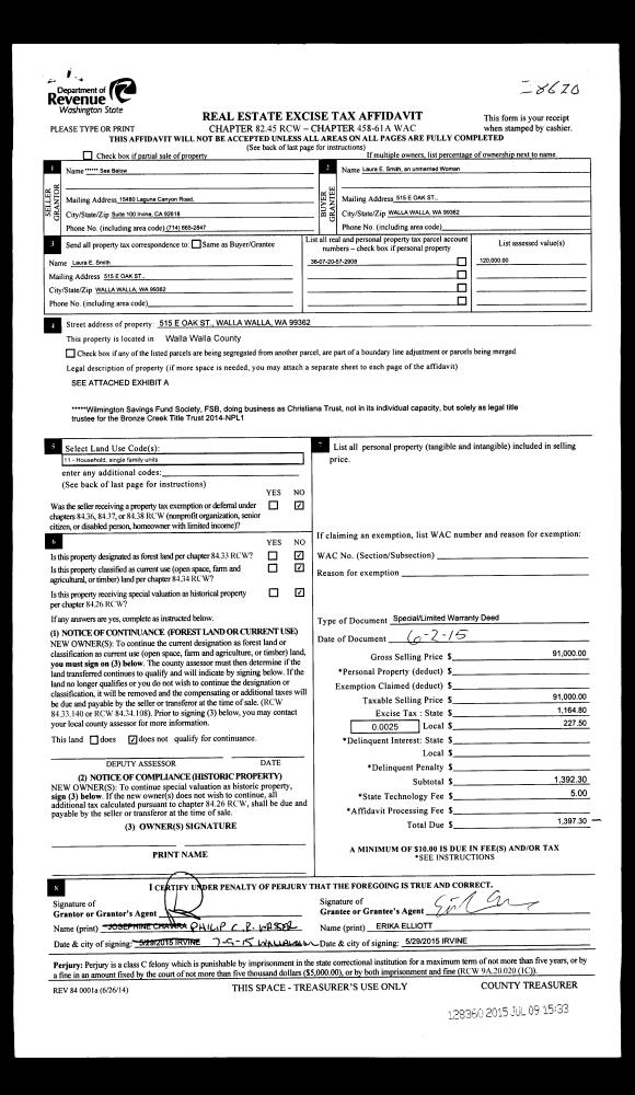 | 2 | 07/09/2015 | SWP | Special Warranty Deed | WILMINGTON SAVINGS FUND SOCIETY | SMITH LAURA E | | | $91,000.00 | 128360 | 2015-05873 |