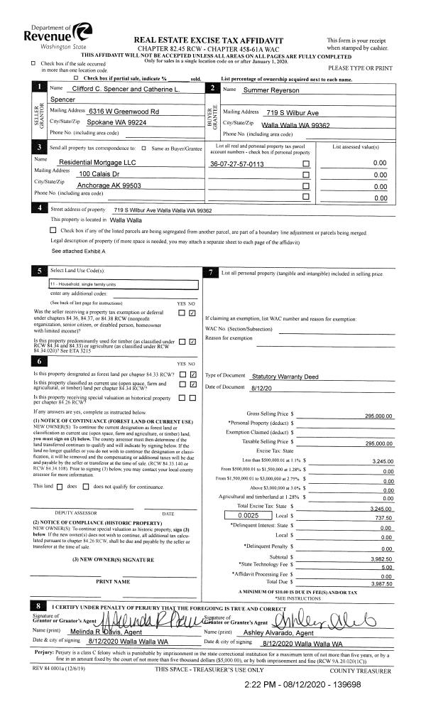 | 1 | 08/12/2020 | SWD | STATUTORY WARRANTY DEED | SPENCER CLIFFORD C & CATHERINE L | REYERSON SUMMER | | | $295,000.00 | 139698 | 2020-07966 |