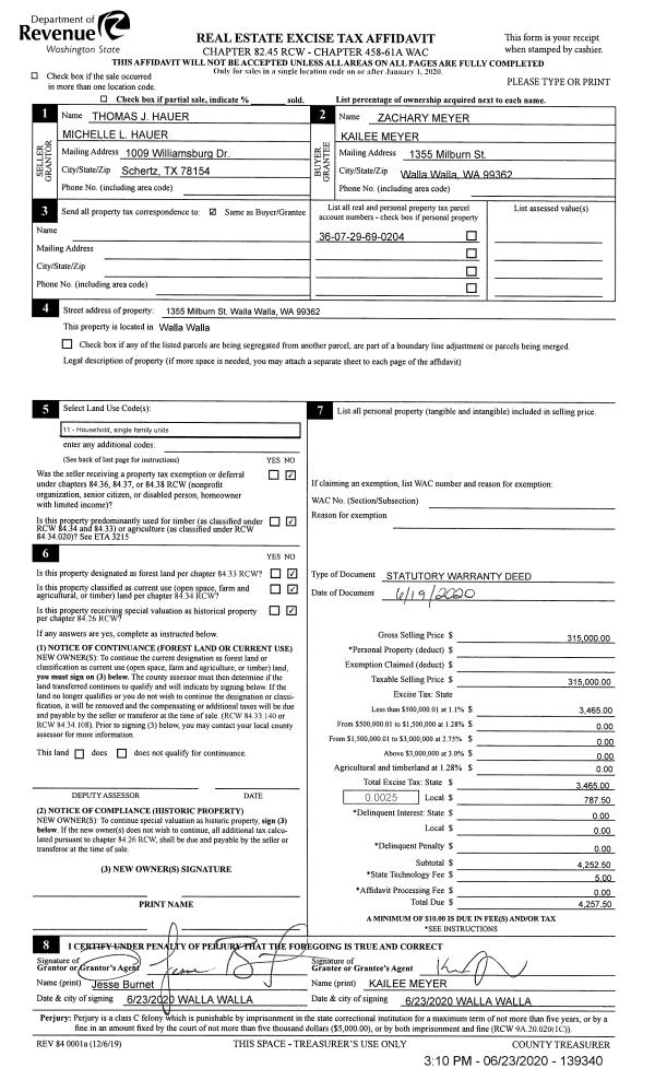 | 1 | 06/23/2020 | SWD | STATUTORY WARRANTY DEED | HAUER THOMAS J & MICHELLE L | MEYER KAILEE & ZACHARY | | | $315,000.00 | 139340 | 2020-05786 |