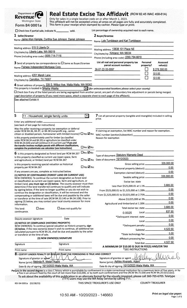 | 1 | 10/20/2023 | SWD | STATUTORY WARRANTY DEED | KEMPLE JAIME ALLYN | TUMBLESON LYLE & KARI | | | $335,000.00 | 146663 | 2023-06167 |