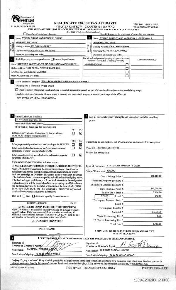 | 5 | 12/12/2012 | WARRANTY D | WARRANTY DEED | CRANE, RYAN D & RENEE E | MURPHY, RYAN D | | | $245,000.00 | 123142 | 2012-11071 |