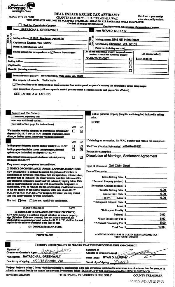 | 4 | 04/20/2015 | QCD | QUIT CLAIM DEED | MURPHY RYAN D | MURPHY RYAN D | | | $0.00 | 128155 | 2015-05188 |