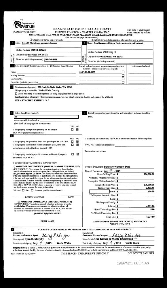 | 3 | 07/10/2015 | SWD | STATUTORY WARRANTY DEED | MURPHY RYAN D | UNDERWOOD MONTE & ONA KARASA | | | $276,000.00 | 128367 | 2015-05913 |