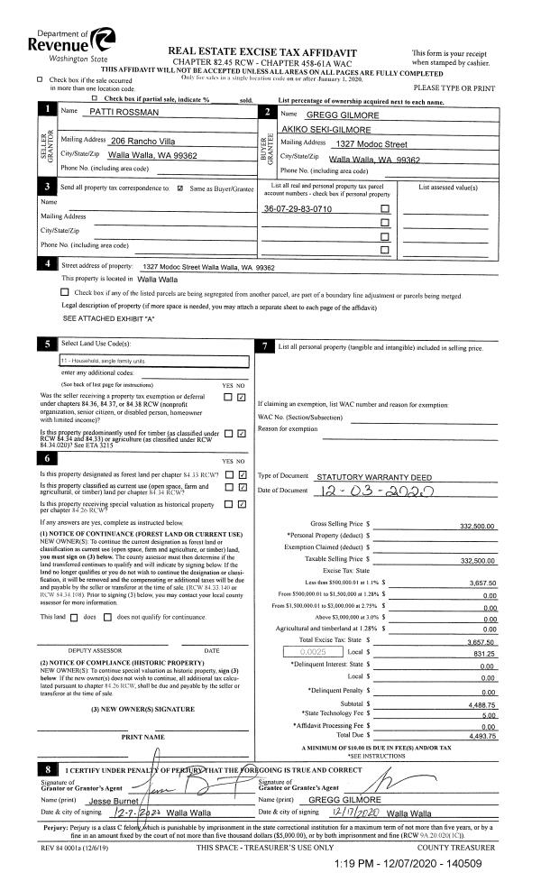 | 1 | 12/07/2020 | SWD | STATUTORY WARRANTY DEED | ROSSMAN PATTI A | GILMORE GREGG | | | $332,500.00 | 140509 | 2020-12964 |