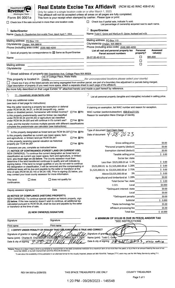 | 1 | 09/28/2023 | QCD | QUIT CLAIM DEED | CHAMBERLAIN CHARLES B IRREV TRUST | QUINN MARILEN R & TODD C | | | | 146548 | 2023-05690 |