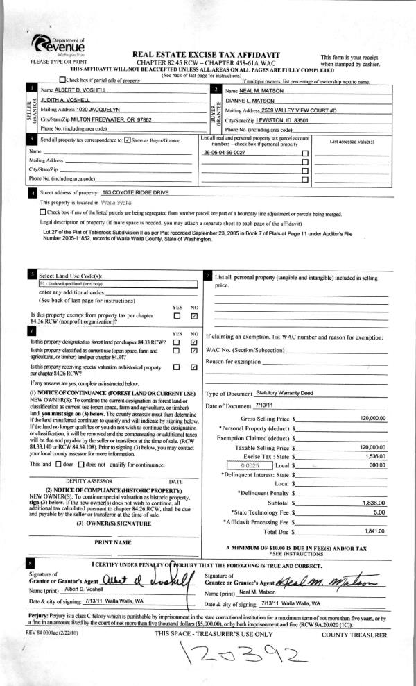 | 2 | 07/13/2011 | WARRANTY D | WARRANTY DEED | VOSHELL, ALBERT D & JUDITH A | MATSON, NEAL M & DIANNE L | | | $120,000.00 | 120392 | 2011-05353 |