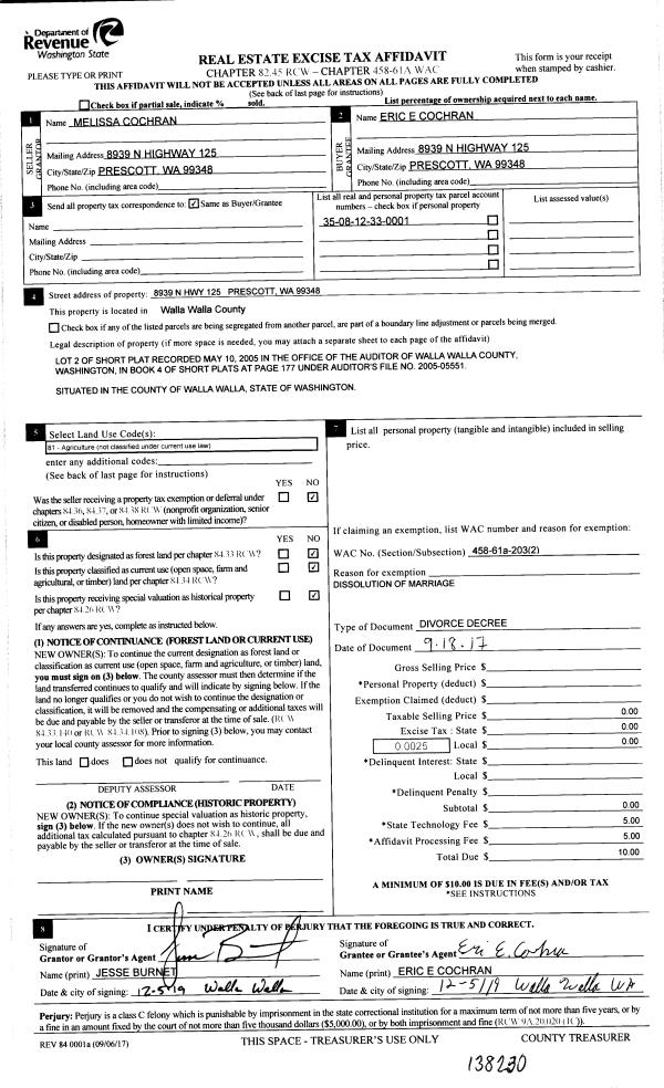 | 1 | 12/05/2019 | COURT CASE | COURT CASE | COCHRAN ERIC E & MELISSA L | COCHRAN ERIC E | | | $0.00 | 138230 | CC 17-3-00113-3 |