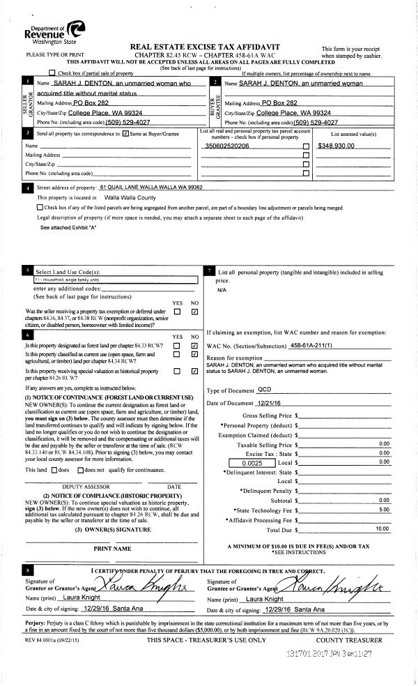 | 1 | 12/29/2016 | QCD | QUIT CLAIM DEED | DENTON SARAH JANE | DENTON SARAH J | | | $0.00 | 131701 | 2017-00016 |
