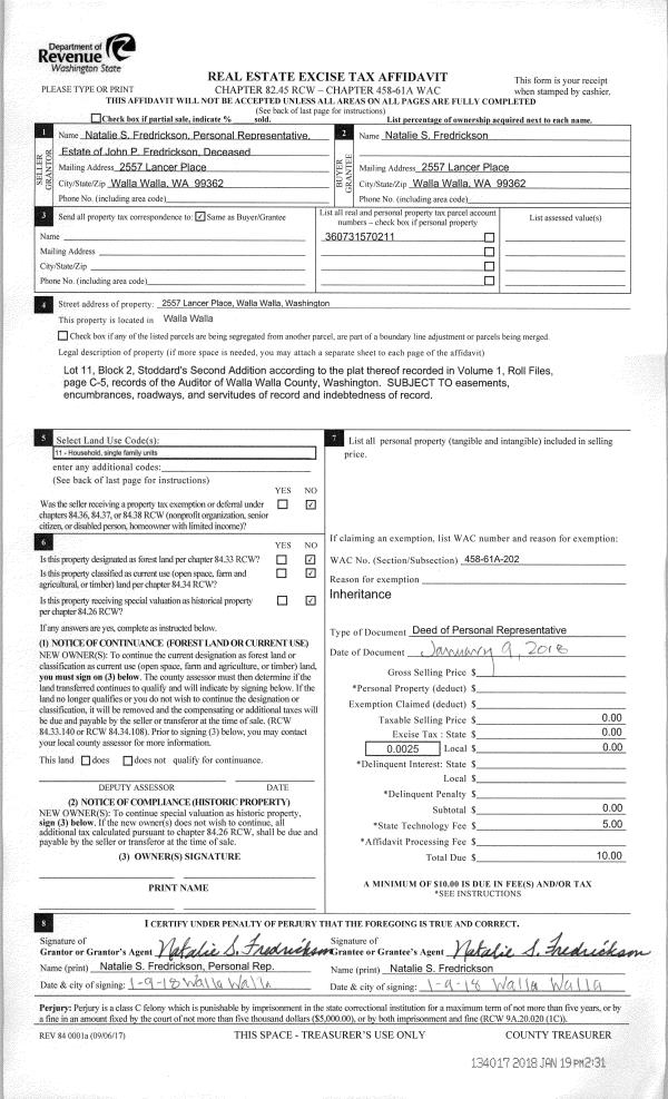 | 4 | 01/09/2018 | DPR | DEED OF PERSONAL REPRESENTATIVE | FREDRICKSON JOHN & NATALIE | FREDRICKSON NATALIE S | | | $0.00 | 134017 | 2018-00545 |