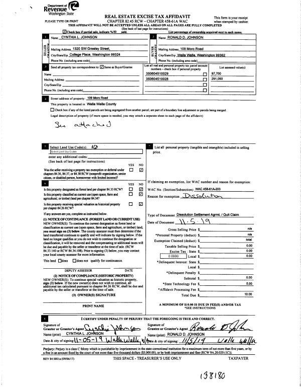 | 2 | 11/05/2019 | QCD | QUIT CLAIM DEED | JOHNSON CYNTHIA L | JOHNSON RONALD D | | | $0.00 | 138180 | 2019-09946 |