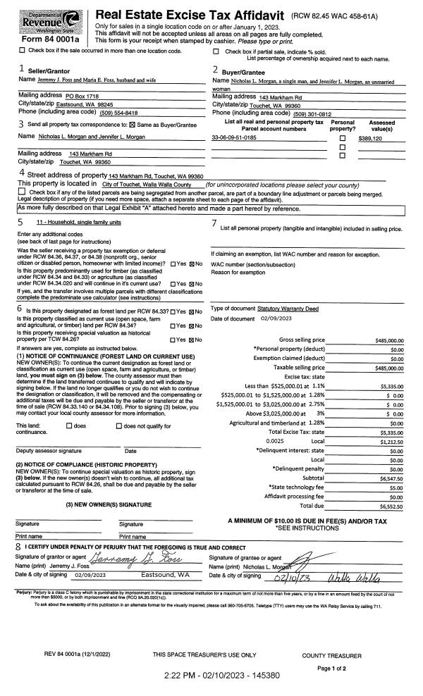 | 1 | 02/10/2023 | SWD | STATUTORY WARRANTY DEED | FOSS JERREMY J & MARIA E | MORGAN NICHOLAS L | | | $485,000.00 | 145380 | 2023-00685 |
