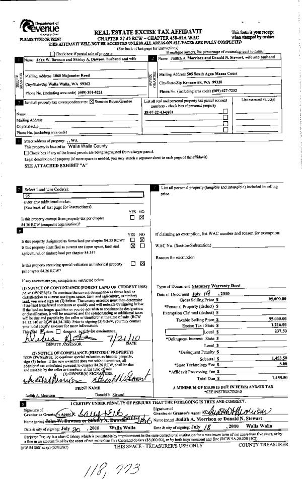 | 2 | 07/21/2010 | WARRANTY D | WARRANTY DEED | DAWSON, JOHN W & SHIRLEY A | STEWART, DONALD N | | | $95,000.00 | 118773 | 2010-05637 |