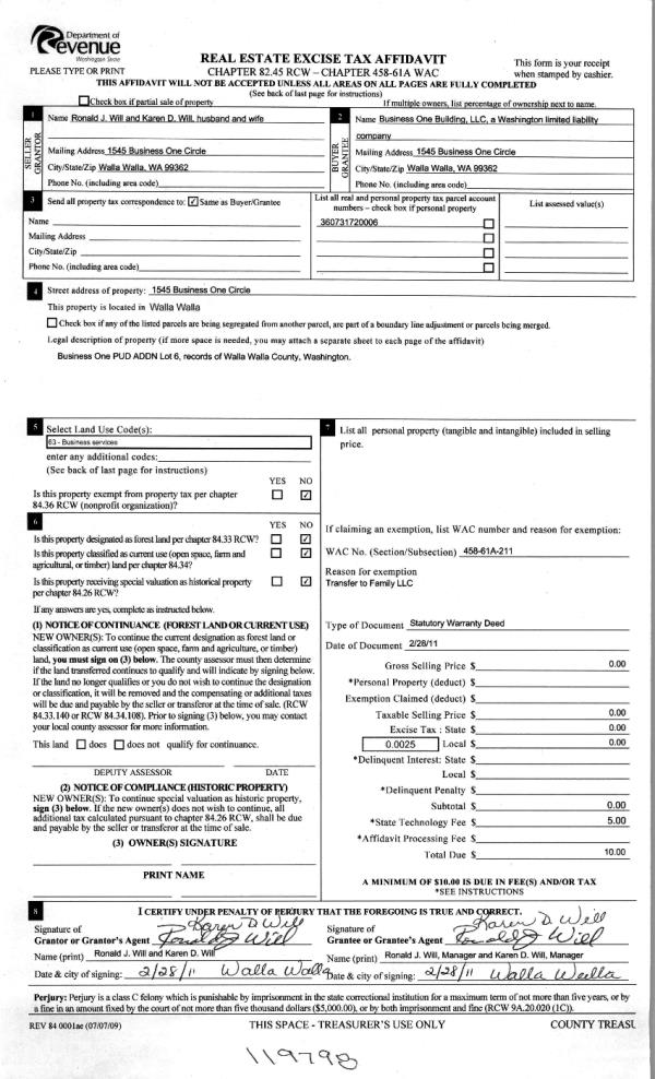 | 1 | 02/28/2011 | WARRANTY D | WARRANTY DEED | WILL, RONALD JAMES & KAREN DIA | BUSINESS ONE BUILDING LLC | | | | 119798 | 2011-01838 |