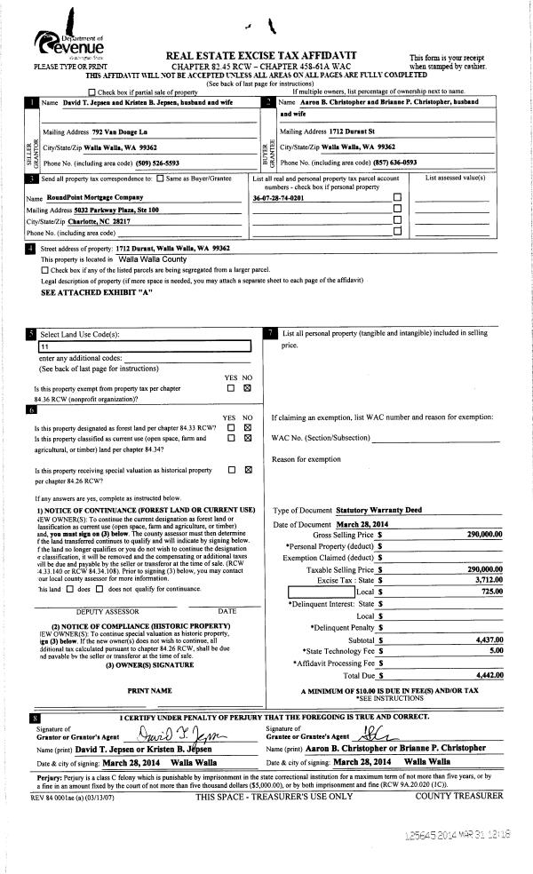 | 3 | 03/31/2014 | SWD | STATUTORY WARRANTY DEED | JEPSEN DAVID & KRISTEN | CHRISTOPHER AARON B & BRIANNE P | | | $290,000.00 | 125645 | 2014-02189 |