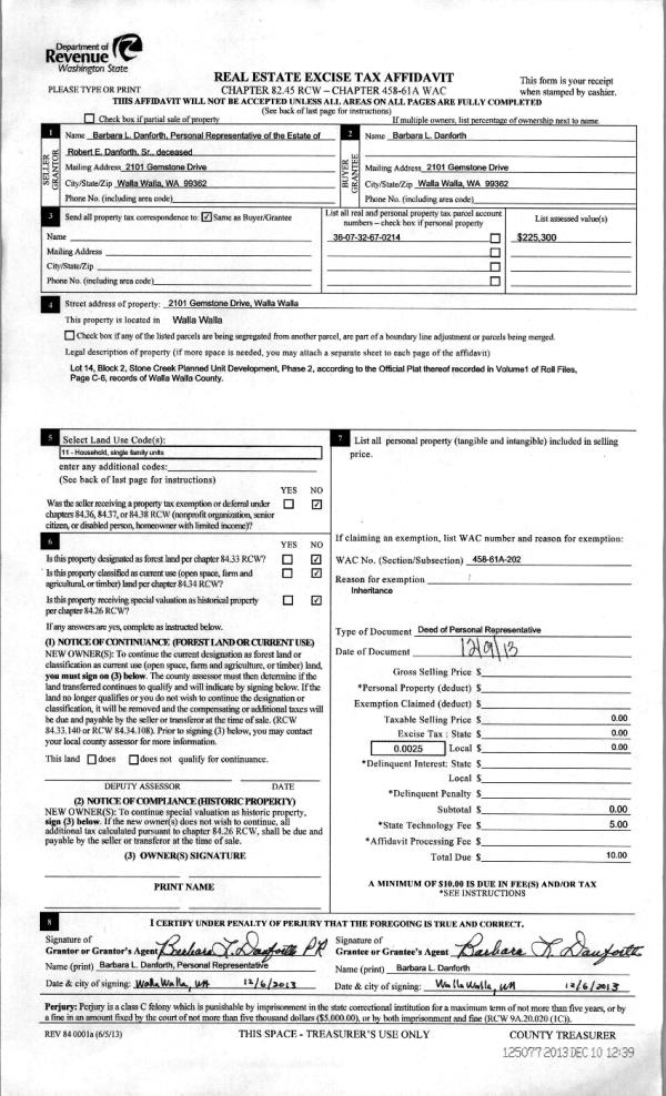 | 2 | 12/06/2013 | DPR | DEED OF PERSONAL REPRESENTATIVE | DANFORTH ROBERT E & BARBARA L | DANFORTH BARBARA L | | | | 125077 | 2013-11828 |
