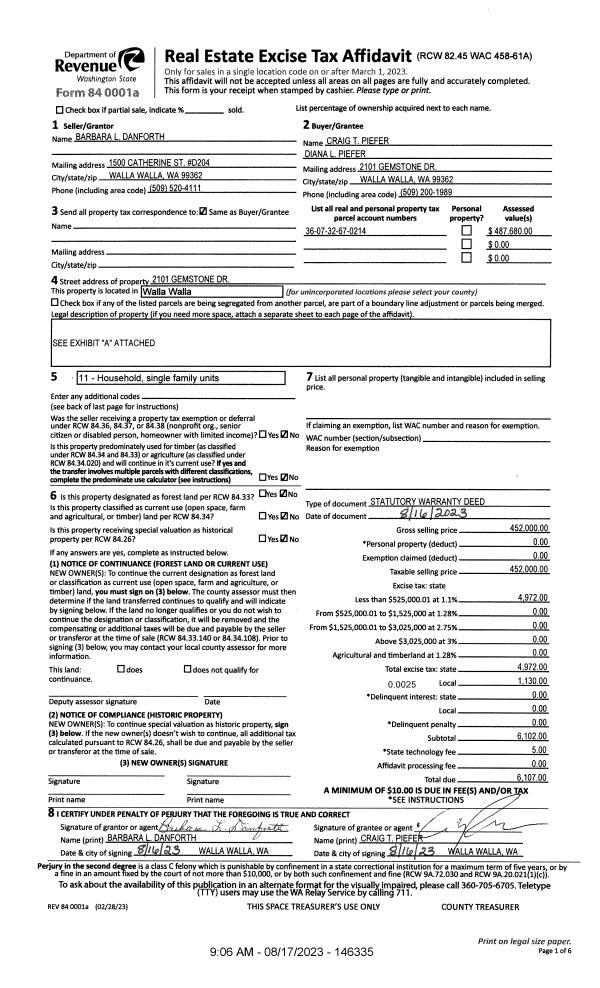 | 1 | 08/17/2023 | SWD | STATUTORY WARRANTY DEED | DANFORTH BARBARA L | PIEFER CRAIG T & DIANA L | | | $452,000.00 | 146335 | 2023-04751 |