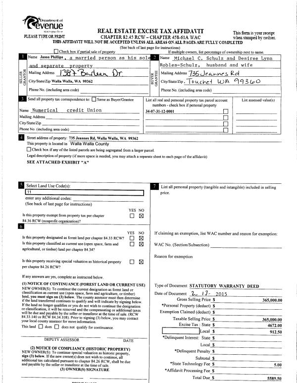 | 3 | 02/13/2015 | SWD | STATUTORY WARRANTY DEED | PHILLIPS JASON | SCHULZ MICHAEL C & DESIREE LYNN ROBLES-SCHULZ | | | $365,000.00 | 127435 | 2015-01385 |