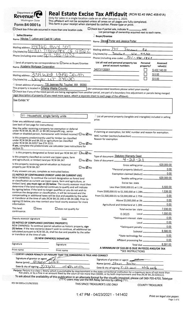 | 1 | 04/23/2021 | SWD | STATUTORY WARRANTY DEED | LEFORE NIKOLAS T & CAELI M | PORTER STEVEN & JESSICA | | | $620,000.00 | 141402 | 2021-04800 |