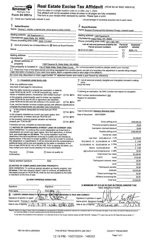 | 1 | 10/07/2024 | SWD | STATUTORY WARRANTY DEED | ADOLFAE THOMAS C | FORSTAG BENJAMIN & ERIN HAMMERS | | | $290,000.00 | 148333 | 2024-05816 |