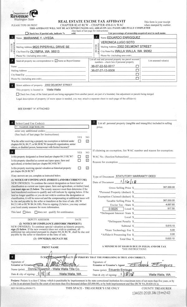 | 1 | 01/19/2018 | SWD | STATUTORY WARRANTY DEED | UYEDA MARIANNE Y | ENRIQUEZ EDUARDO | | 2-PARCELS | $367,000.00 | 134020 | 2018-00550 |