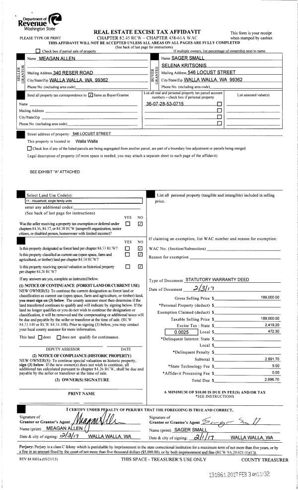 | 1 | 02/03/2017 | SWD | STATUTORY WARRANTY DEED | ALLEN MEAGAN | SMALL SAGER | | | $189,000.00 | 131861 | 2017-00932 |
