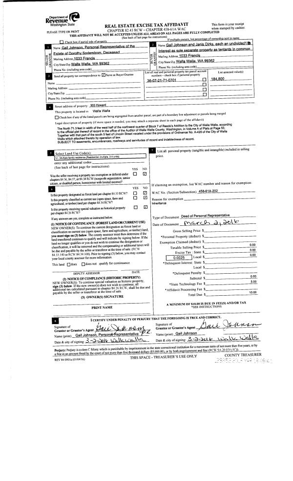 | 2 | 03/02/2016 | DPR | DEED OF PERSONAL REPRESENTATIVE | SODERSTROM DOROTHY E ESTATE OF | JOHNSON GAIL | | | $0.00 | 129852 | 2016-02009 |