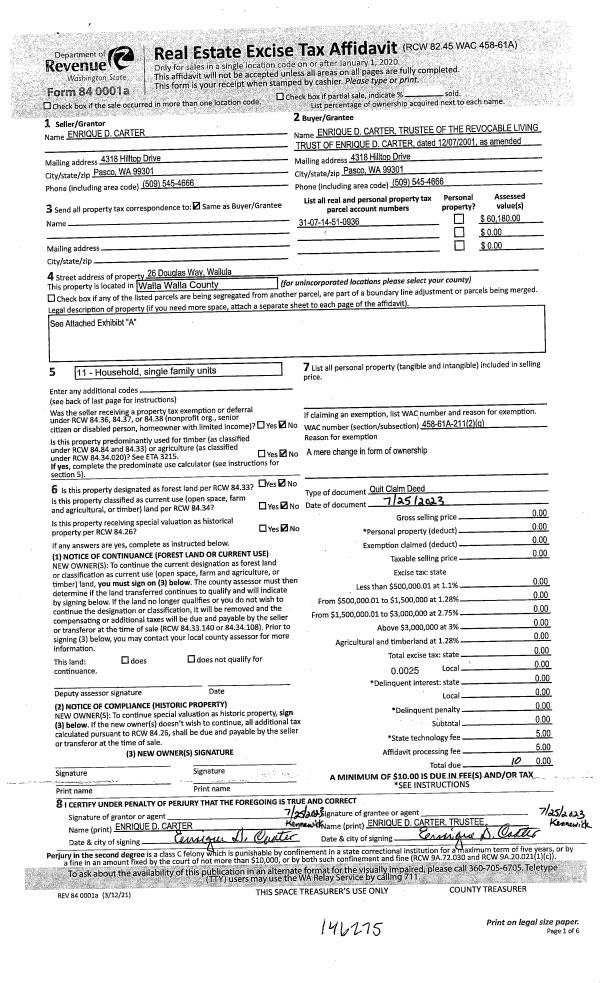 | 1 | 10/11/2023 | QCD | QUIT CLAIM DEED | CARTER ENRIQUE D | CARTER ENRIQUE D REVOCABLE LIVING TRUST OF | | | | 146275 | 2023-04514 |
