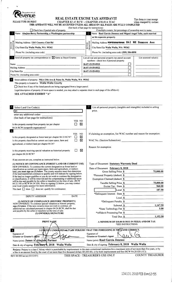 | 1 | 02/08/2018 | SWD | STATUTORY WARRANTY DEED | ABAJIAN-BERRY | JIMENEZ RAUL GARCIA | | 3-PARCELS | $0.00 | 134131 | 2018-01101 |