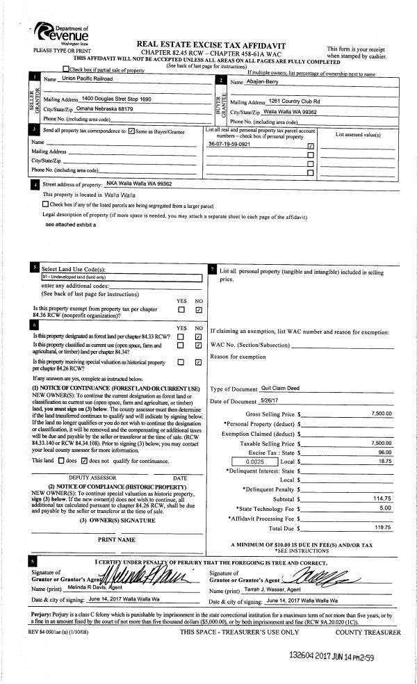 | 2 | 06/14/2017 | QCD | QUIT CLAIM DEED | UNION PACIFIC RAILROAD CO | ABAJIAN-BERRY | | | $7,500.00 | 132604 | 2017-04552 |