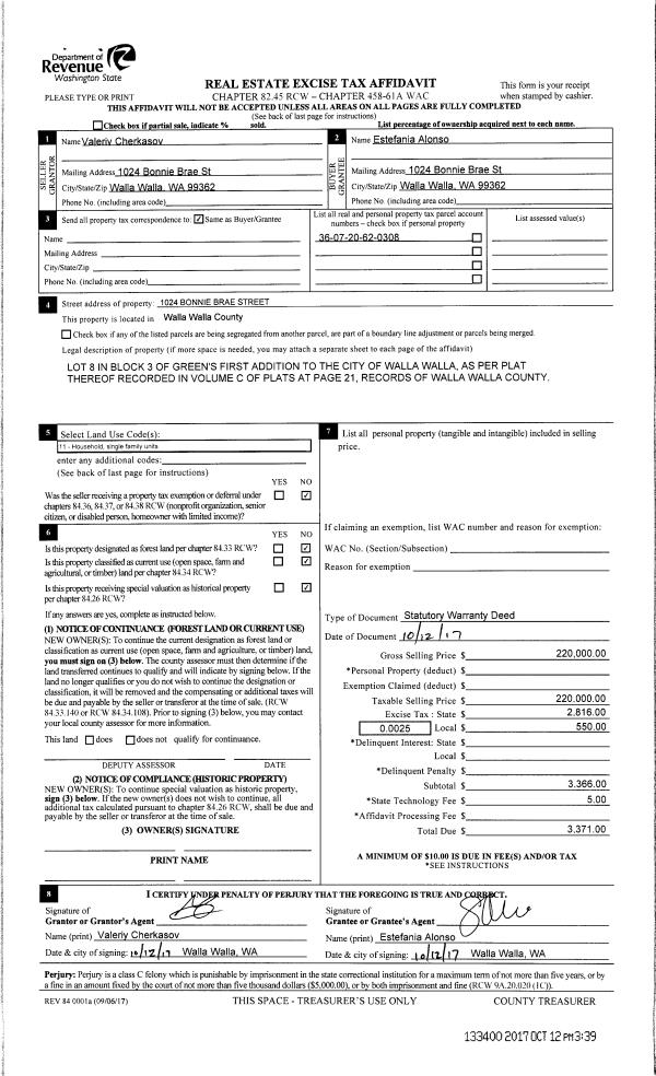 | 4 | 10/12/2017 | SWD | STATUTORY WARRANTY DEED | CHERKASOV VALERIY | ALONSO ESTEFANIA | | | $220,000.00 | 133400 | 2017-08123 |