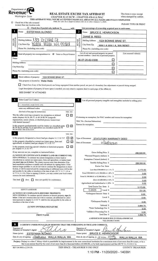 | 2 | 11/20/2020 | SWD | STATUTORY WARRANTY DEED | ALONSO ESTEFANIA | HENRICKSON BRUCE E & DIANE B REED | | | $288,500.00 | 140391 | 2020-12311 |