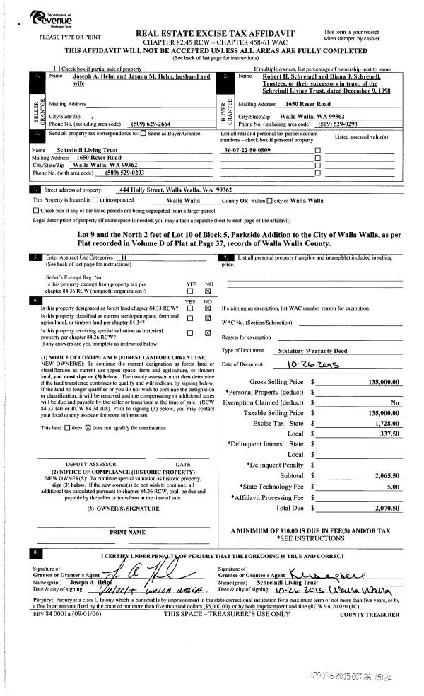 | 2 | 10/26/2015 | SWD | STATUTORY WARRANTY DEED | HELM JOSEPH A & JASMIN M | SCHREINDL LIVING TRUST | | | $135,000.00 | 129076 | 2015-09383 |