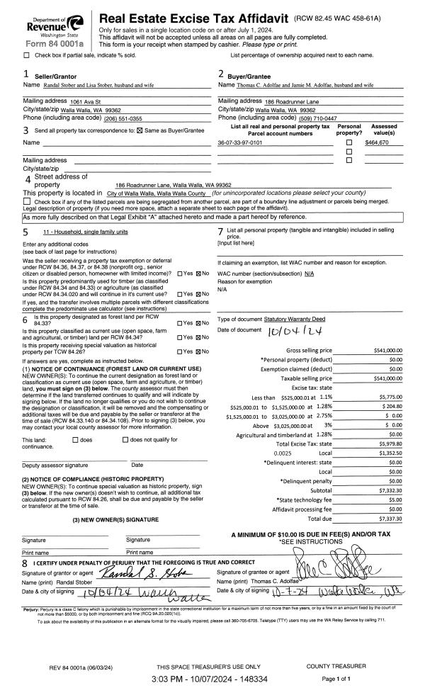 | 1 | 10/07/2024 | SWD | STATUTORY WARRANTY DEED | STOBER RANDAL & LISA | ADOLFAE THOMAS C & JAIME M | | | $541,000.00 | 148334 | 2024-05832 |