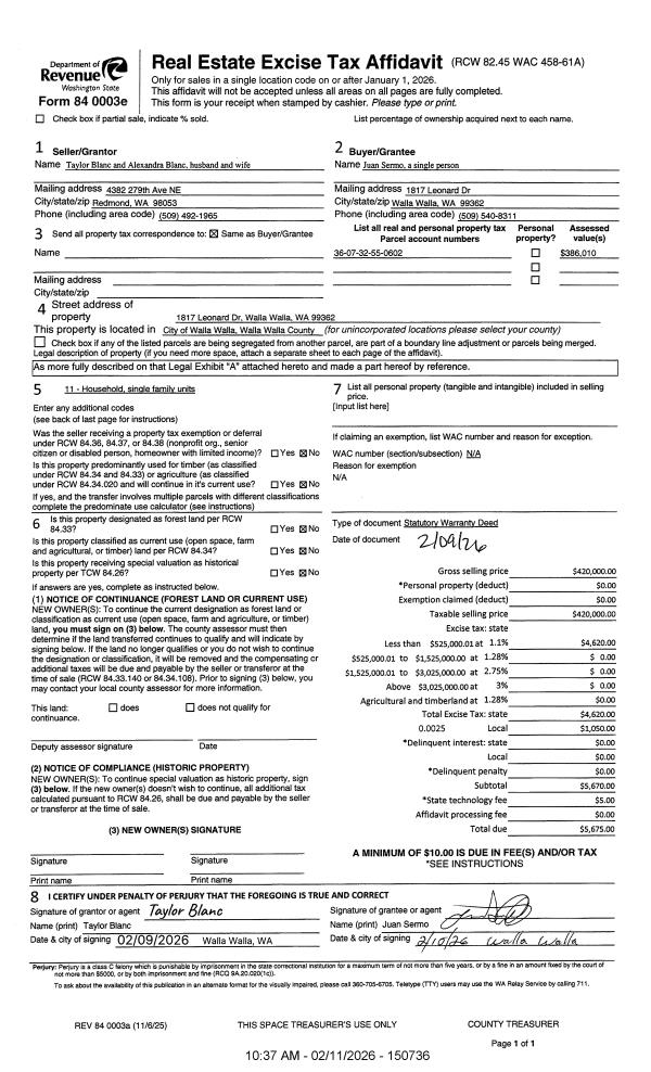 | 1 | 02/11/2026 | SWD | STATUTORY WARRANTY DEED | BLANC TAYLOR & ALEXANDRA | SERNO JUAN | | | $420,000.00 | 150736 | 2026-00831 |